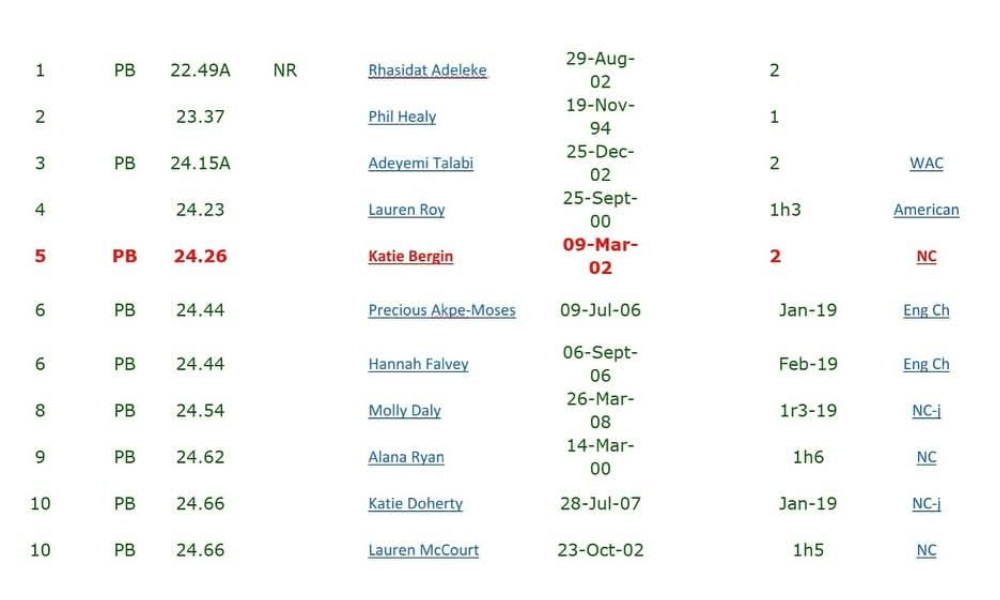 Katie Bergin Ranked No 5 in 200m Indoors in 2024.